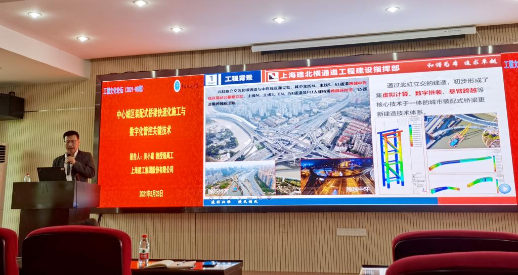 (通讯员 梁荣柱)2021年5月23日下午,应工程糖果派对 院长焦玉勇教授和梁荣柱副研究员的邀请,上海建工集团股份有限公司工程研究总院副院长、糖果派对 (武汉)兼职教授吴小建教授级高级工程师作客2021年第8期糖果派对论坛 ,作“中心城区装配式桥梁快速化施工与数字化管控关键技术”专题报告。工程糖果派对 副院长窦斌教授代表糖果派对 对吴小建教高的到来表示欢迎,并介绍了吴小建教高的基本科研和工作履历。讲座由梁荣柱副研究员主持,约一百名师生参与报告会。