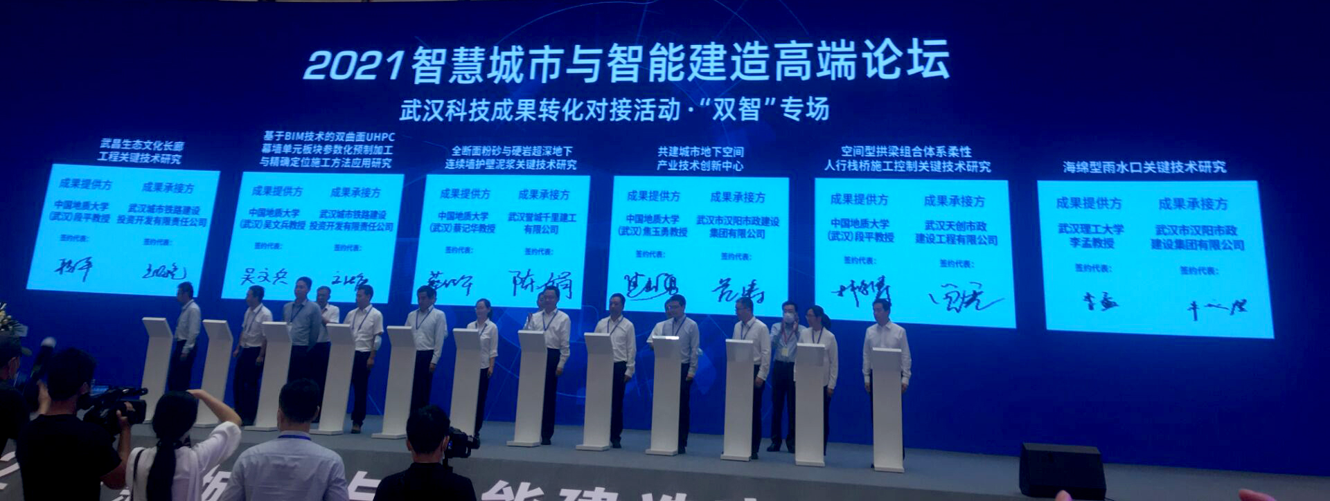 (通讯员:刘浩、张美霞)9月24日,工程糖果派对 院长焦玉勇教授应邀率队出席2021智慧城市与智能建造(“双智”)高端论坛。开幕式“武汉科技成果转化对接活动 双智专场”上,焦玉勇带领糖果派对 蔡记华、吴文兵、林俊涛、刘浩4位老师分别与武汉市汉阳市政建设集团有限公司、武汉市誉城千里有限公司、武汉市城市铁路建设投资开发有限公司签订了共建技术创新中心、糖果派对人才培养 与科技成果转化合作协议。糖果派对 与武汉市相关部门和企业开展深度合作,将为湖北省“一主引领、两翼驱动、全域协同”的区域发展布局,和武汉建设“宜居城市、韧性城市、智慧城市、绿色城市、人文城市”的重大需求提供技术和人才支持。