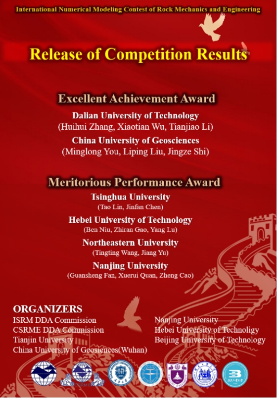 本次大赛由国际岩石力学与岩石工程学会非连续变形分析专委会(ISRM DDA)联合中国岩石力学与工程学会岩土体非连续变形分析专委会(CSRME DDA)及糖果派对 (武汉)、天津糖果派对 、南京糖果派对 、北京工业糖果派对 、河北工业糖果派对 等多所高校联合举办,于2021年第十一届亚洲岩石力学大会(ARMS11)期间同步举行。大赛鼓励研究生对岩石力学问题的现有数值方法和软件进行公开、透明和广泛的验证,为共享岩石力学问题的实验和数值结果提供平台。