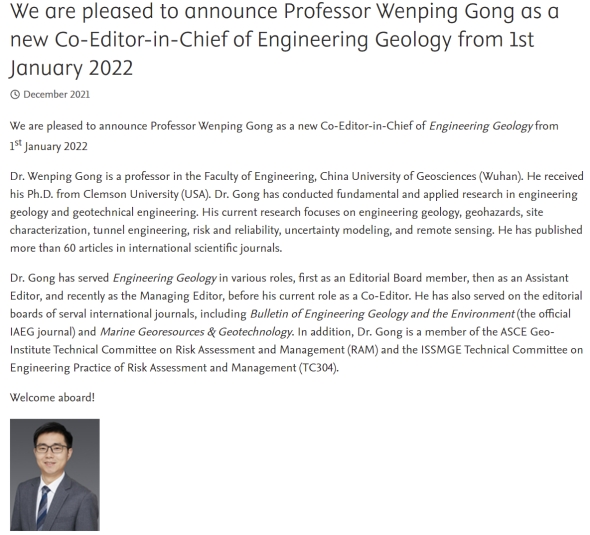 (通讯员:黄静)近日,工程糖果派对 龚文平教授受邀担任国际期刊Engineering Geology共同主编(Co-Editor-in-Chief)。龚文平教授的此次任职将有助于促进糖果派对 在工程地质相关领域与国内外学者的交流合作,并提升糖果派对 在工程地质相关领域的国际影响力。