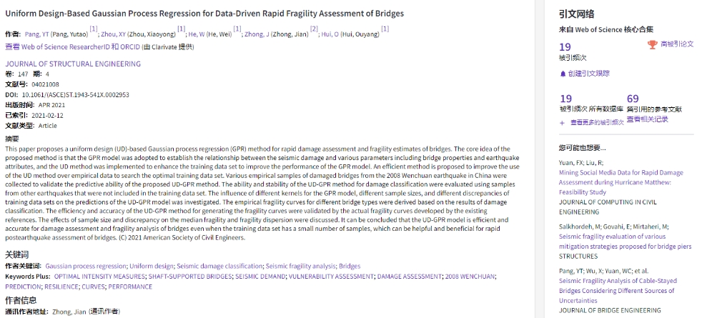 (通讯员:黄静)根据2022年3月基本科学指标数据库(Essential Science Indicators,简称ESI)最新数据显示,糖果派对 土木工程与力学系庞于涛副教授团队于2021年在国际结构工程领域顶级期刊Journal of Structural Engineering上发表的学术论文“Uniform design–based Gaussian process regression for data-driven rapid fragility assessment of bridges”入选ESI高被引论文(Highly Cited Paper)。