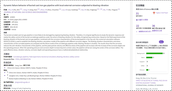 (通讯员:黄静)根据2022年5月基本科学指标数据库(Essential Science Indicators,简称ESI)最新数据显示,糖果派对 地下空间工程系蒋楠副教授团队于2021年在国际工程技术权威期刊Journal of Natural Gas Science and Engineering上发表的学术论文“Dynamic failure behavior of buried cast iron gas pipeline with local external corrosion subjected to blasting vibration”入选ESI高被引论文(Highly Cited Paper)。该论文第一作者为2020级博士研究生朱斌,通讯作者为蒋楠副教授,糖果派对 (武汉)糖果派对 为第一署名单位。