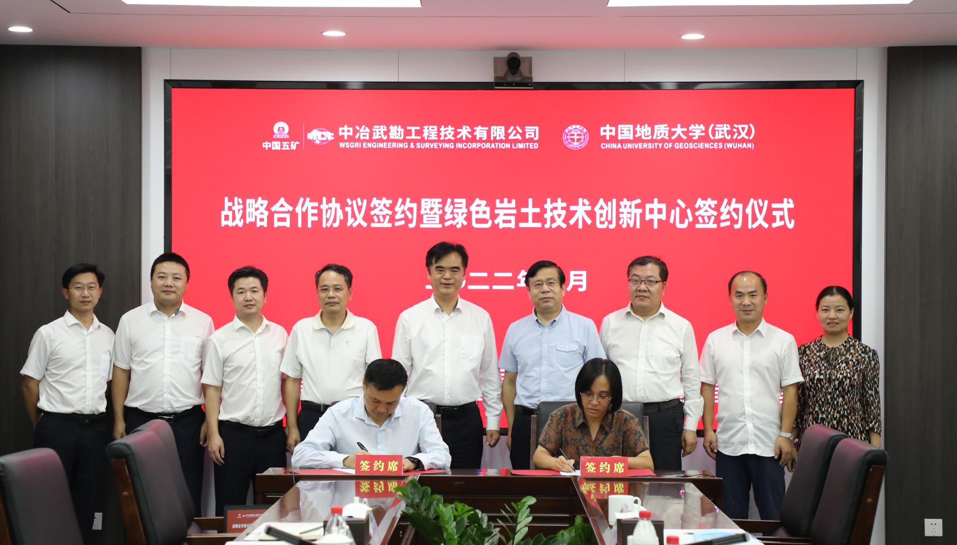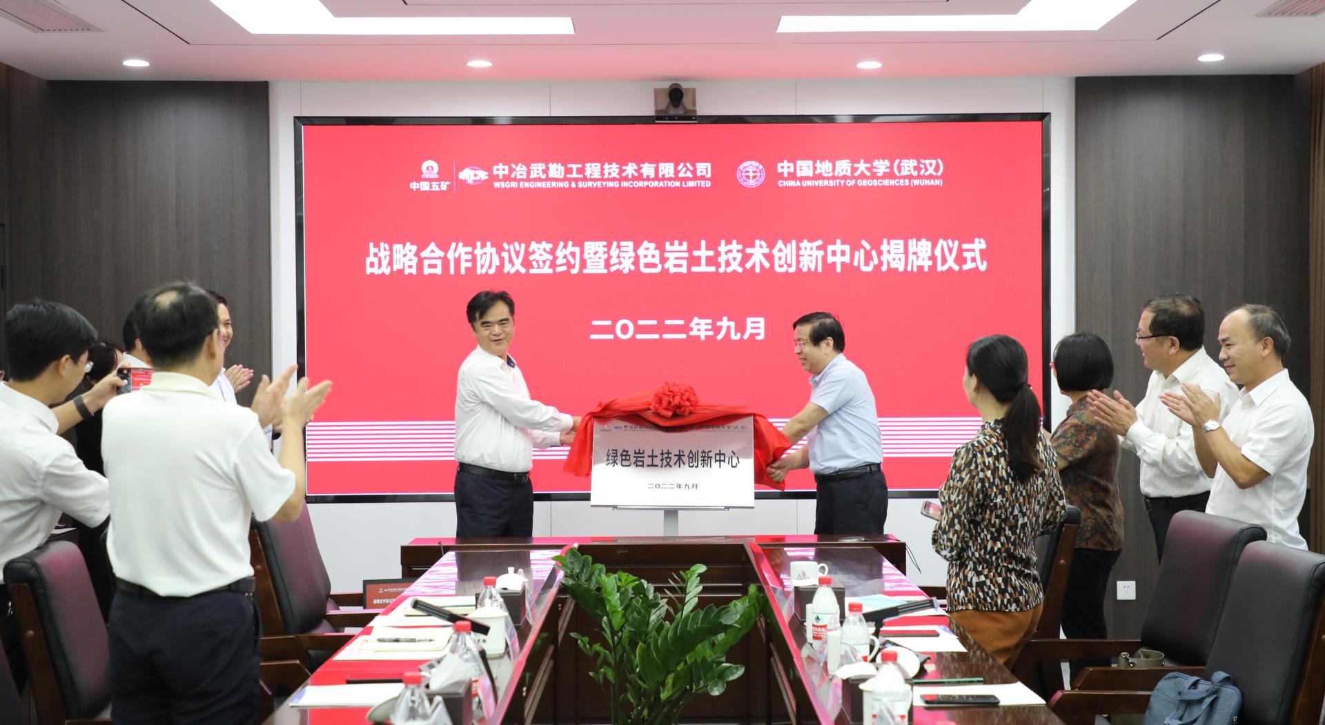 (武汉)党委副书记唐辉明,中冶武勘党委书记、董事长臧中海见证签约并共同为“绿色岩土技术创新中心”揭牌。双方将把科教资源优势和工程技术成果转化优势紧密结合,在产学研用协同创新、人才培养等方面进行全方位的合作。