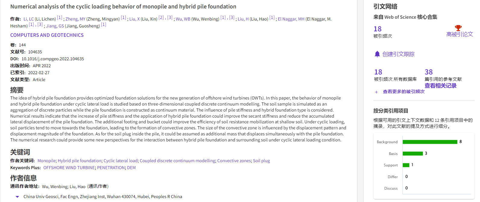 根据2022年11月基本科学指标数据库(Essential Science Indicators,简称ESI)最新数据显示,工程糖果派对 勘察与基础工程系吴文兵教授团队于2022年在国际岩土工程数值模拟权威期刊Computers and Geotechnics上发表的学术论文“Numerical analysis of the cyclic loading behavior of monopile and hybrid pile foundation”入选ESI高被引论文。该论文第一作者为勘察与基础工程系博士后李立辰,通讯作者为吴文兵教授,糖果派对 (武汉)工程糖果派对 为第一署名单位。