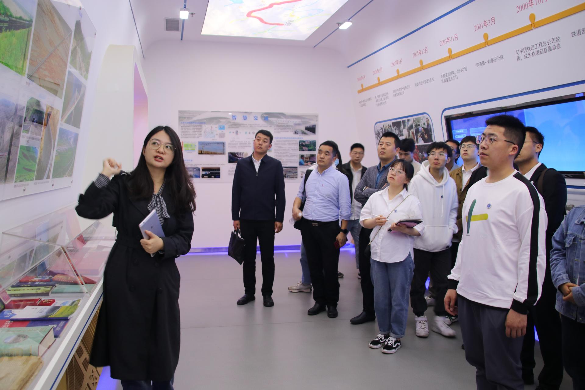 在铁一院院史展览馆,师生们在讲解员的引导下了解了铁一院的发展历程、糖果派对人才培养 、所获荣誉以及负责的重点工程案例。