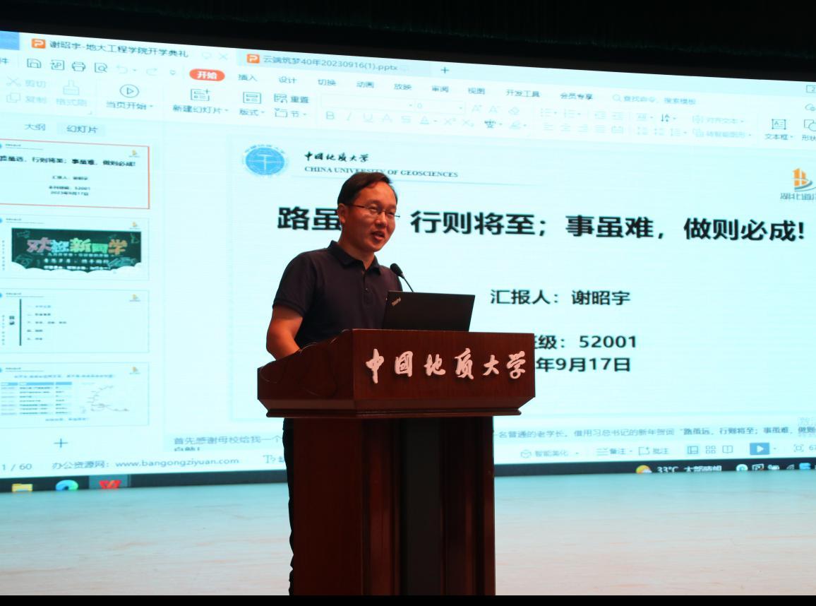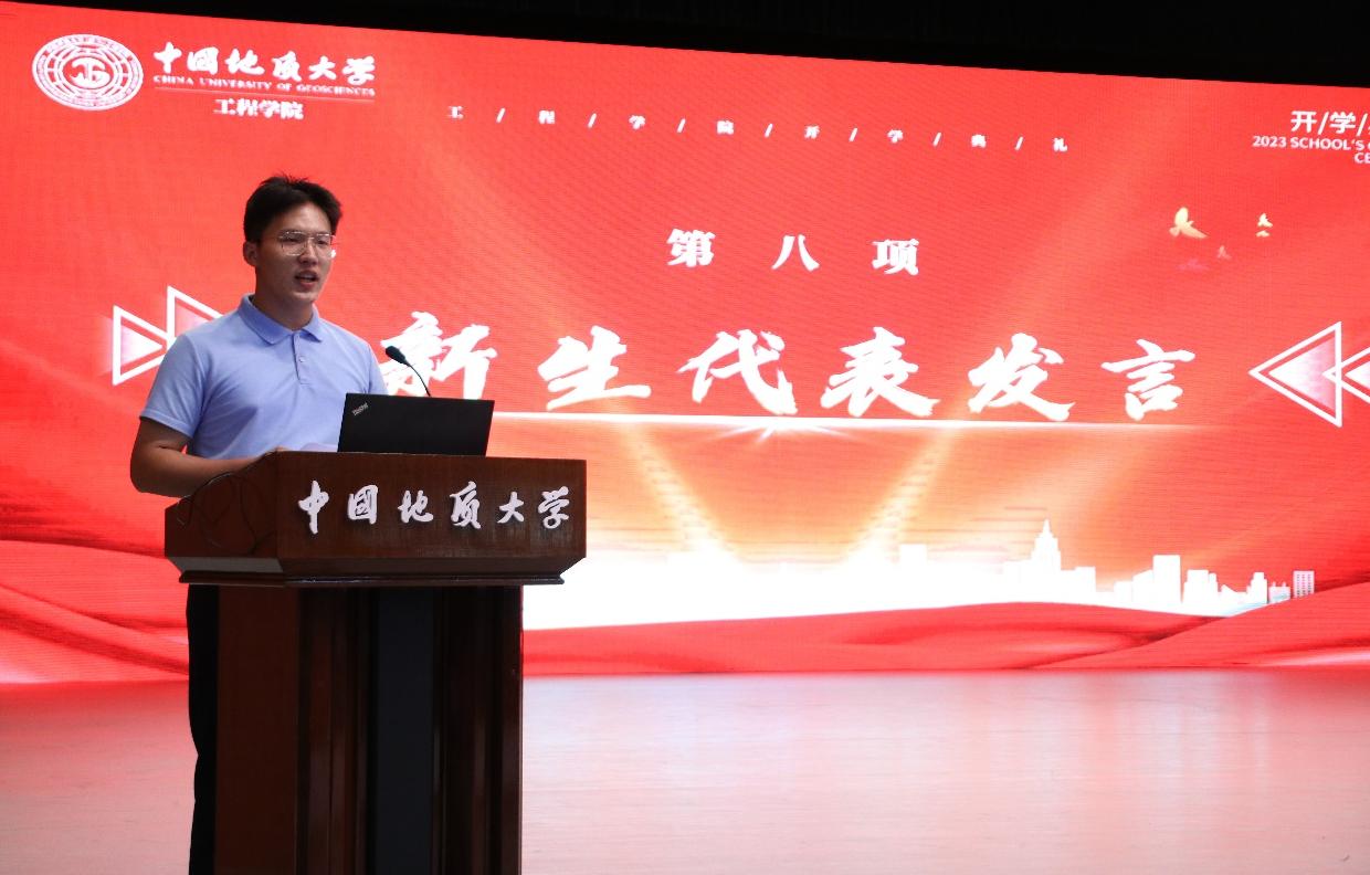 2023级05D231班张高涵同学作为本科生新生代表发言。他说,在长辈厚重岩土气息的熏陶下,自己终于如愿考进地质糖果派对 ,加入工程糖果派对 。他对开学报到以来糖果派对 领导老师给予的教育关怀表示感谢,对军事训练当中空军预警糖果派对 教官对自己坚忍毅力和良好作息的打造由衷感激,他立志与其他505名本科新生同学一道,以强国建设、民族复兴的时代号召为号角,以“品德高尚、基础厚实、专业精深、知行合一”的成才目标为向导,直挂云帆,乘风破浪,早日成为德智体美劳全面发展的中国特色社会主义事业的建设者和接班人。