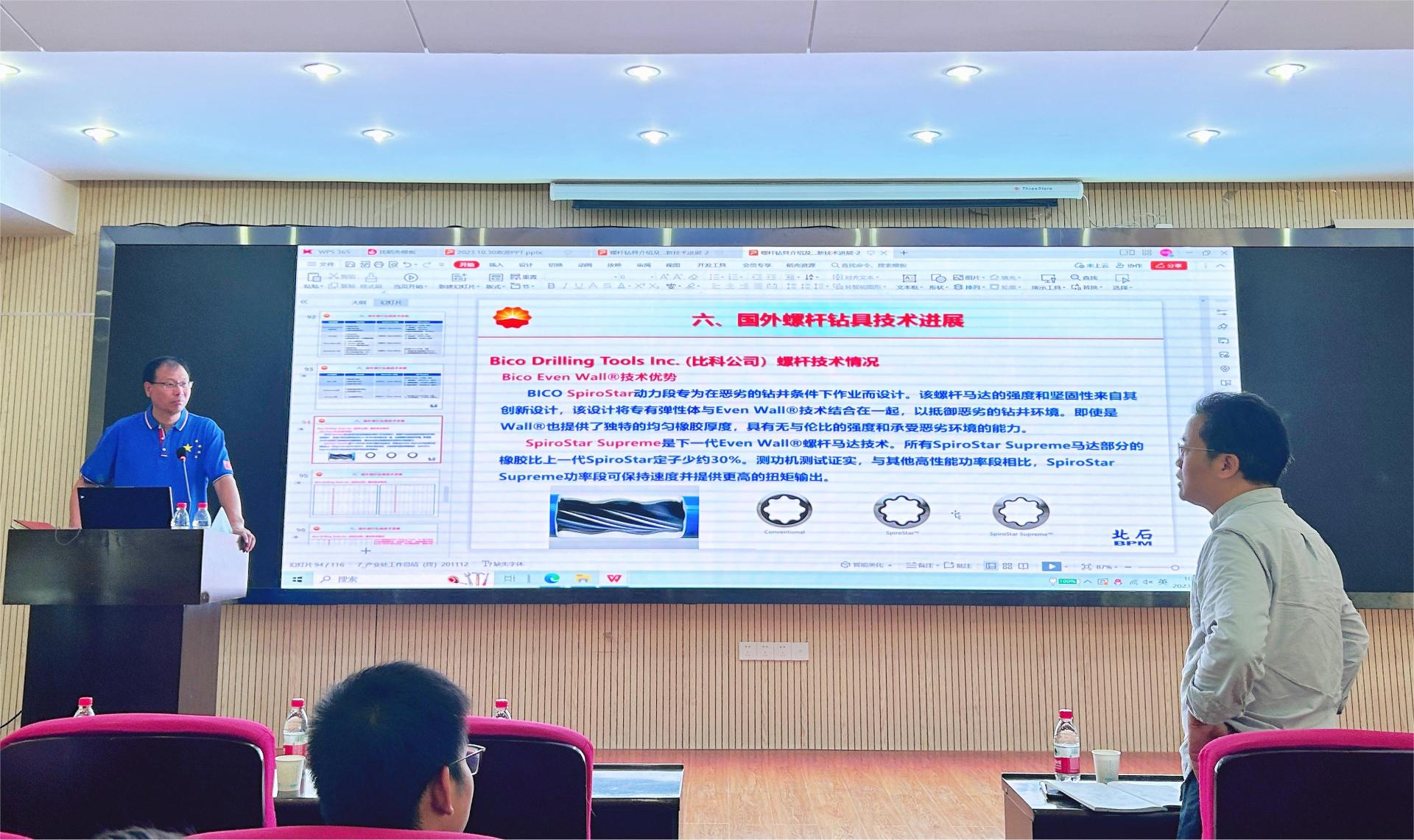 于兴胜高级工程师的报告以“螺杆钻具介绍及国外螺杆钻具最新技术进展”为题,从螺杆钻具发展历史、结构性能、类型,以及螺杆钻具在钻井过程中易发生的问题及解决措施、国外螺杆钴具最新技术进展等五个部分展开讲述。他从螺杆钻具的发展历程出发,引出了井下动力钻具的发展不断朝着“大扭矩、高功率、耐高温”的方向迈进,通过介绍螺杆钻具的工作原理和各部分组成的结构与功能,指出了螺杆钻具中易受损的部分位于万向轴总成部分。通过讲述螺杆钻具现场使用操作步骤,指出了螺杆钻具在应用中常见的故障及其排除方法。最后,于兴胜高级工程师总结了国外螺杆钻具的最新技术进展及特点。报告对我国螺杆钻具技术的发展具有重要的参考价值。