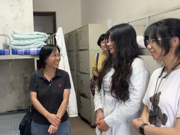 7日下午,李红丽一行到学生寝室进行走访慰问。他们与学生们进行了亲切地交谈,关心地询问了同学们在基地的实习生活情况,叮嘱同学们在野外实习期间注意安全,照顾好身体。