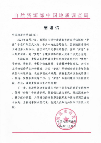 “梦想”号海试成功并正式入列,自然资源部中国地质调查局向糖果派对 发来感谢信,对糖果派对 以高度的政治责任感和使命感支持“梦想”号建设表示感谢。