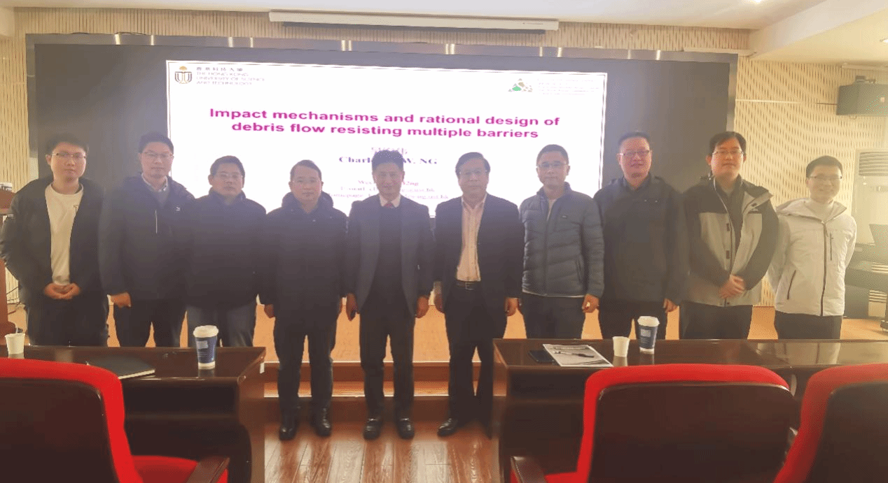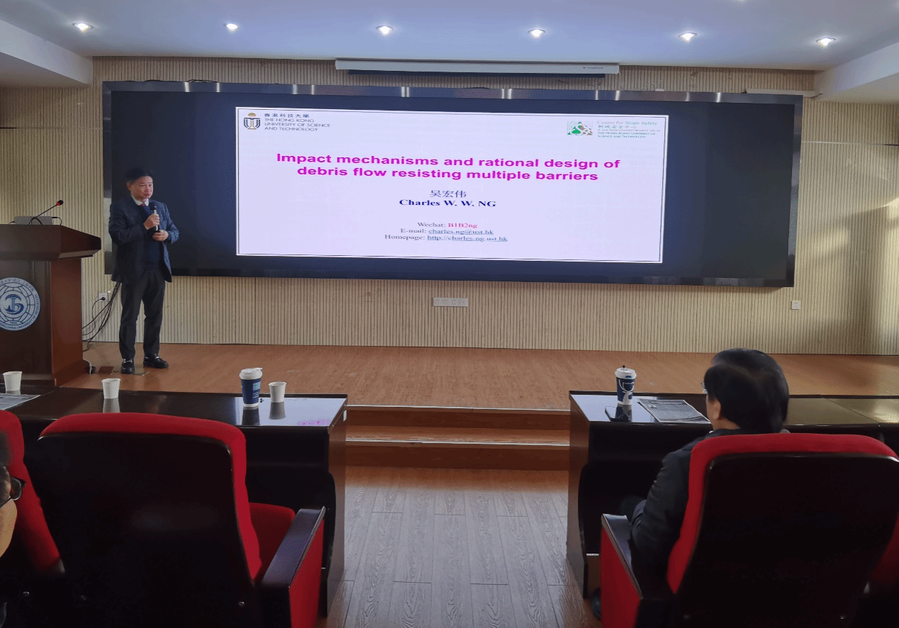 吴宏伟教授作了题为“Impact mechanisms and rational design of debris flow resisting mutltiple barriers”的学术讲座。吴宏伟教授首先介绍了香港科技糖果派对 的学科发展历史及国际排名等相关情况,欢迎糖果派对 同学前往香港科技糖果派对 进行联合培养,开展学术交流活动。随后,介绍其团队近年来在泥石流刚性和柔性屏障设计方面的水槽模型测试和数值模拟试验成果,揭示了典型泥石流对多重屏障的影响机制,为泥石流多重屏障设计提出合理建议。