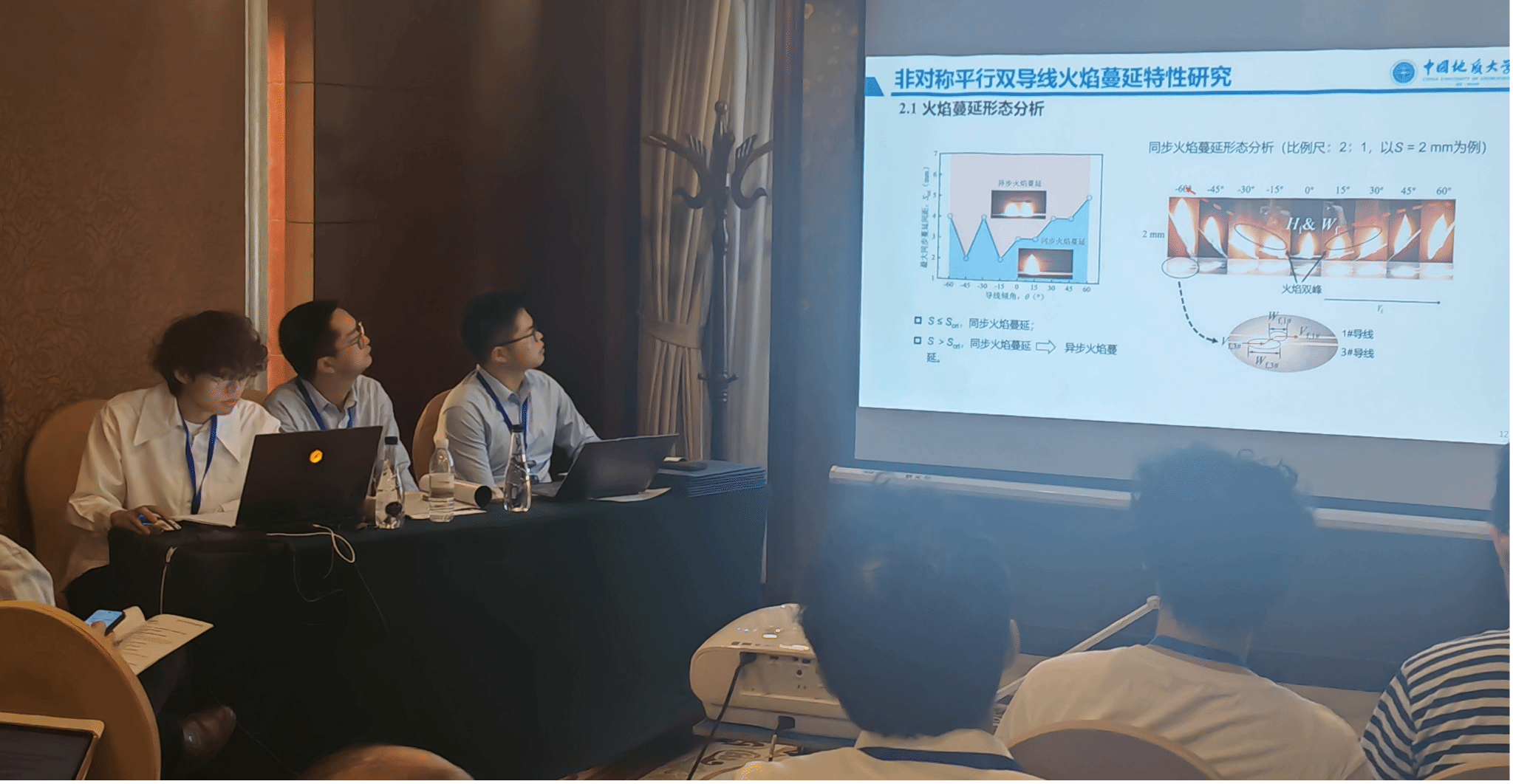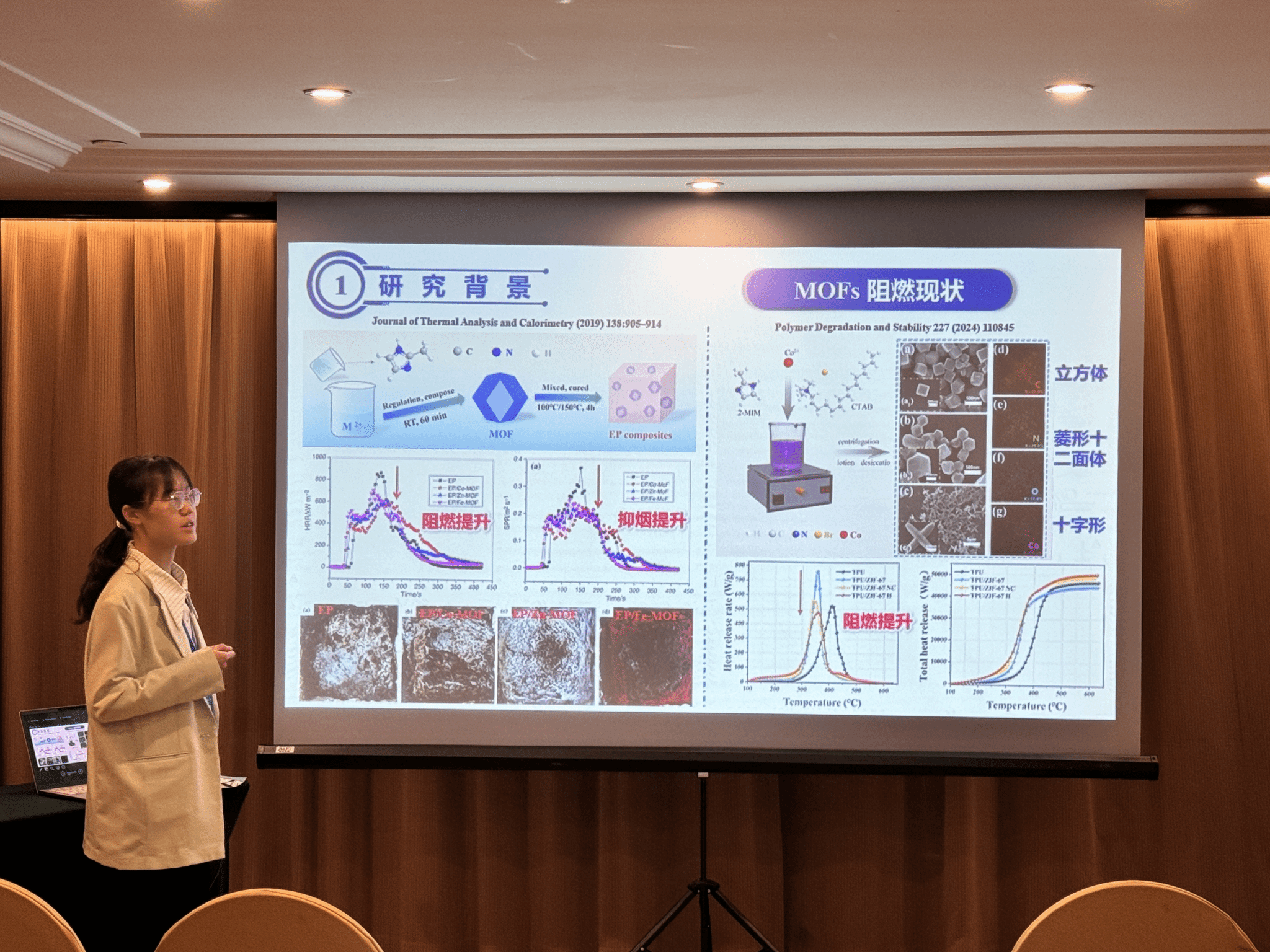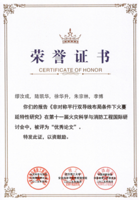 此外,糖果派对 研究生印恋在阻燃耐火论坛作题为“卟啉基有机框架衍生物分子设计及其阻燃增韧研究”报告、罗瑊瑊在阻燃耐火论坛作题为“生物启发微中空MOFs的界面锁定效应:环氧树脂复合材料的耐火与增韧性能优化研究”报告、缪汝成在火灾机理论坛作题为“非对称平行双导线布局条件下火蔓延特性研究”报告,孟祥龙在火灾烟气论坛作题为“空气幕射流作用下的开口溢流发展行为研究”报告,宗志伟在受限空间火灾论坛作题为“墙角型壁面限制条件下的火羽流行为特性研究”报告。其中,陆凯华副教授指导的硕士研究生缪汝成获得会议优秀论文奖。