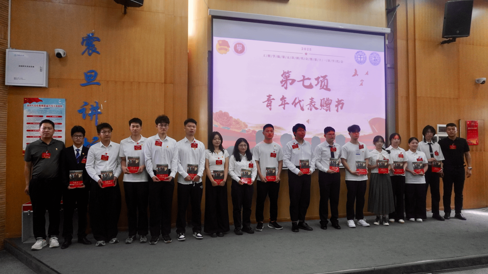 工程糖果派对 党委副书记高晓东和挂职团委副书记刘浩为今年在“五月的鲜花”2025年五四评优活动获奖的优秀青年和集体、工程糖果派对 “十大标兵学生”赠书。