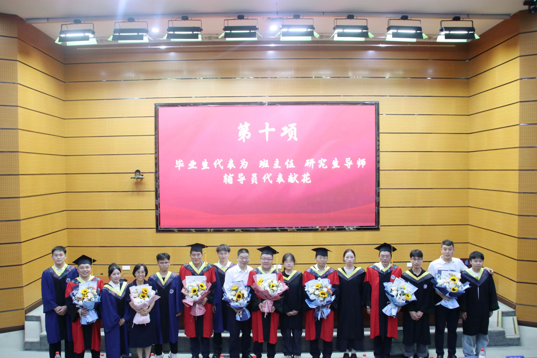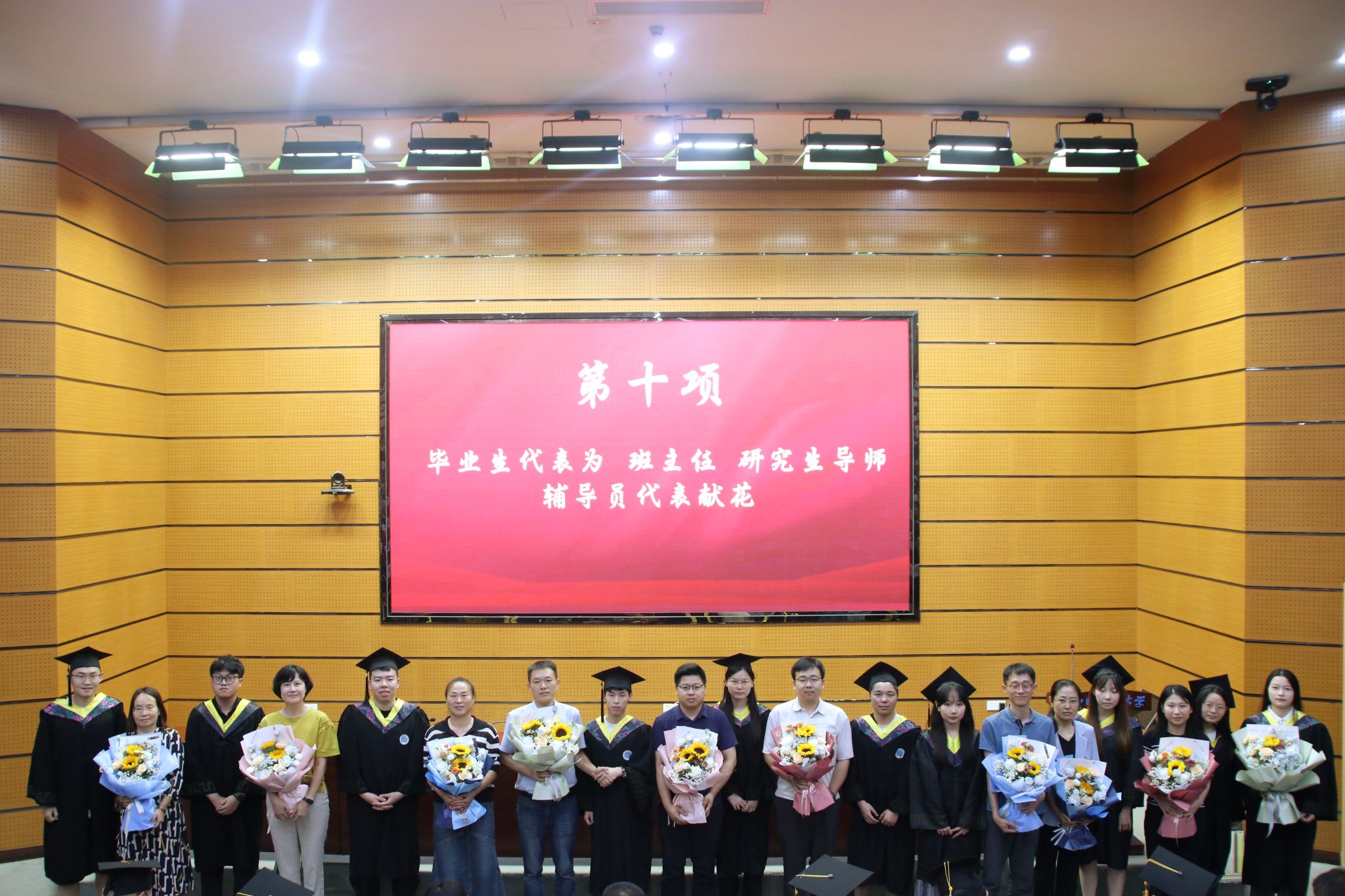 随后,毕业生代表向研究生导师、班主任、辅导员献花。感恩老师们一路的辛勤培育和谆谆教诲。