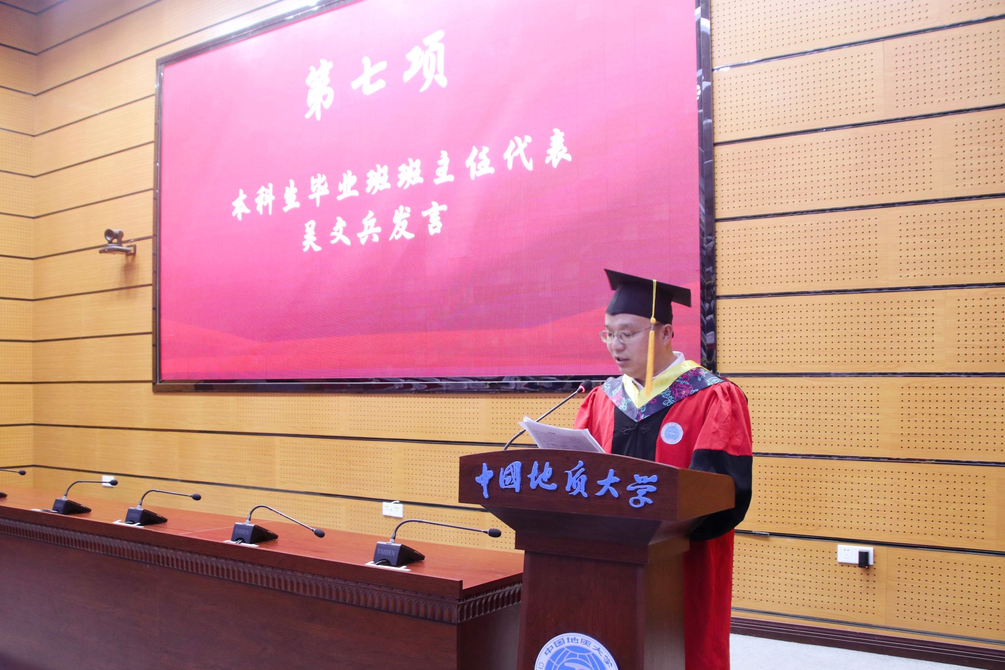 本科生毕业班班主任代表吴文兵发言。他回顾了糖果派对 的光荣历史和工程人求真务实、开拓创新的精神底色,鼓励毕业生们继承糖果派对 优良传统,以科学态度解决复杂工程难题,用实际行动践行扎根基层、服务国家的使命,勇立科技浪潮之首,以严谨治学和开拓创新精神引领变革。