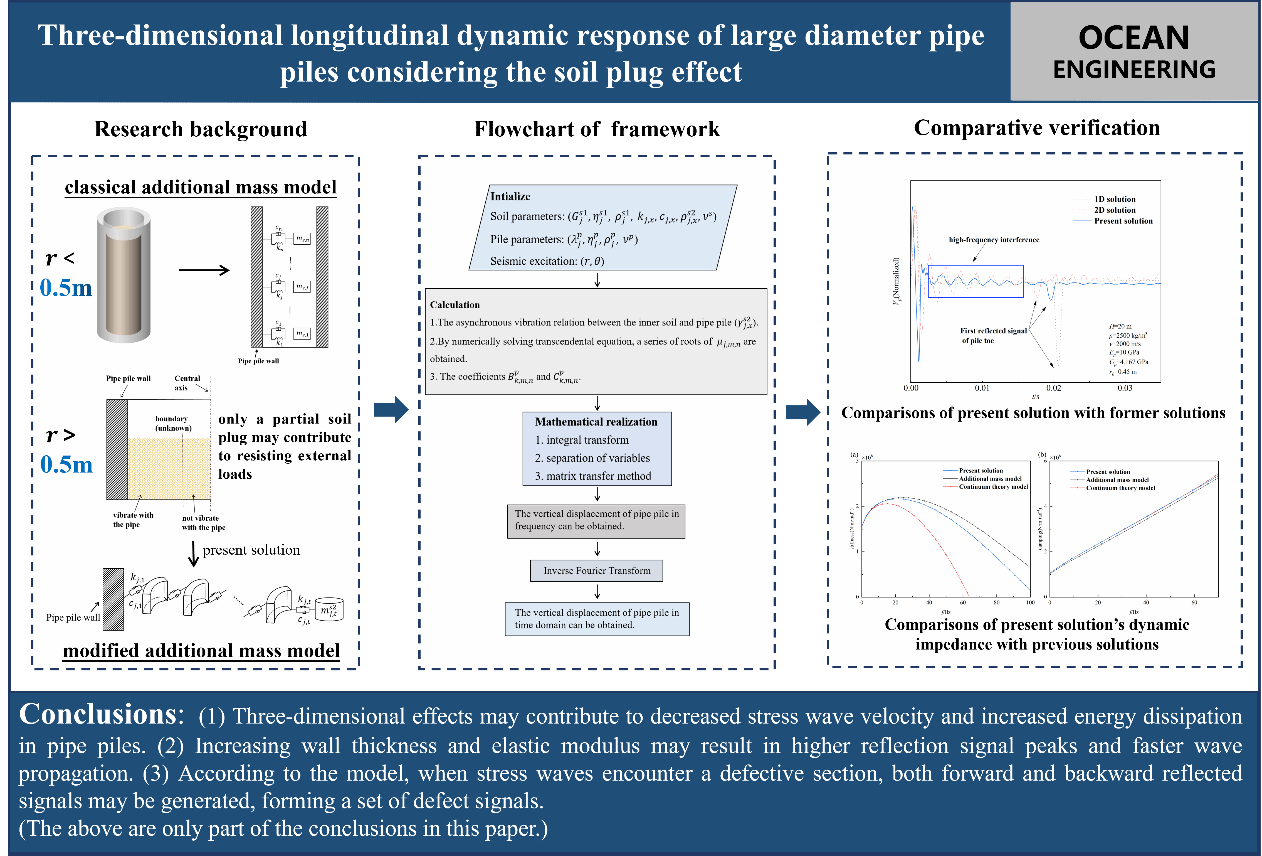(通讯员 张云鹏) 随着海洋强国建设的深入推进,大型海洋工程设施对高性能桩基的设计与安全评估提出了更高要求。近日,糖果派对 勘察与基础工程系在创新型人才培养方面取得重要突破,由张云鹏特任教授指导的本科生王明以第一作者身份,在海洋工程领域国际top期刊《Ocean Engineering》上发表了题为“Three-dimensional longitudinal dynamic response of large diameter pipe piles considering the soil plug effect”的研究论文。张云鹏特任教授为论文的通讯作者,此项成果标志着勘察与基础工程系在课堂教学衍生、打造创新课堂方面进入了新阶段。