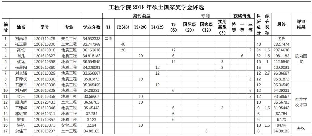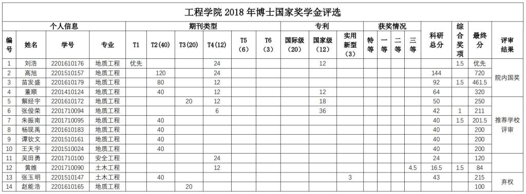 经个人申报,糖果派对 研究生国家奖学金评审委员会秘书处资格审查,糖果派对 研究生国家奖学金评审委员会于2018年9月29日下午组织通过资格审查的申报者(其中博士研究生14人,硕士研究生17人)进行答辩评审,糖果派对 研究生国家奖学金监审委员会全程监督。会议确定了刘昌坤等8名硕士研究生,刘浩等4名博士研究生为工程糖果派对 2018 年研究生国奖学金候选人。现将工程糖果派对 2018 年国家奖学金候选人公示(见下表)。