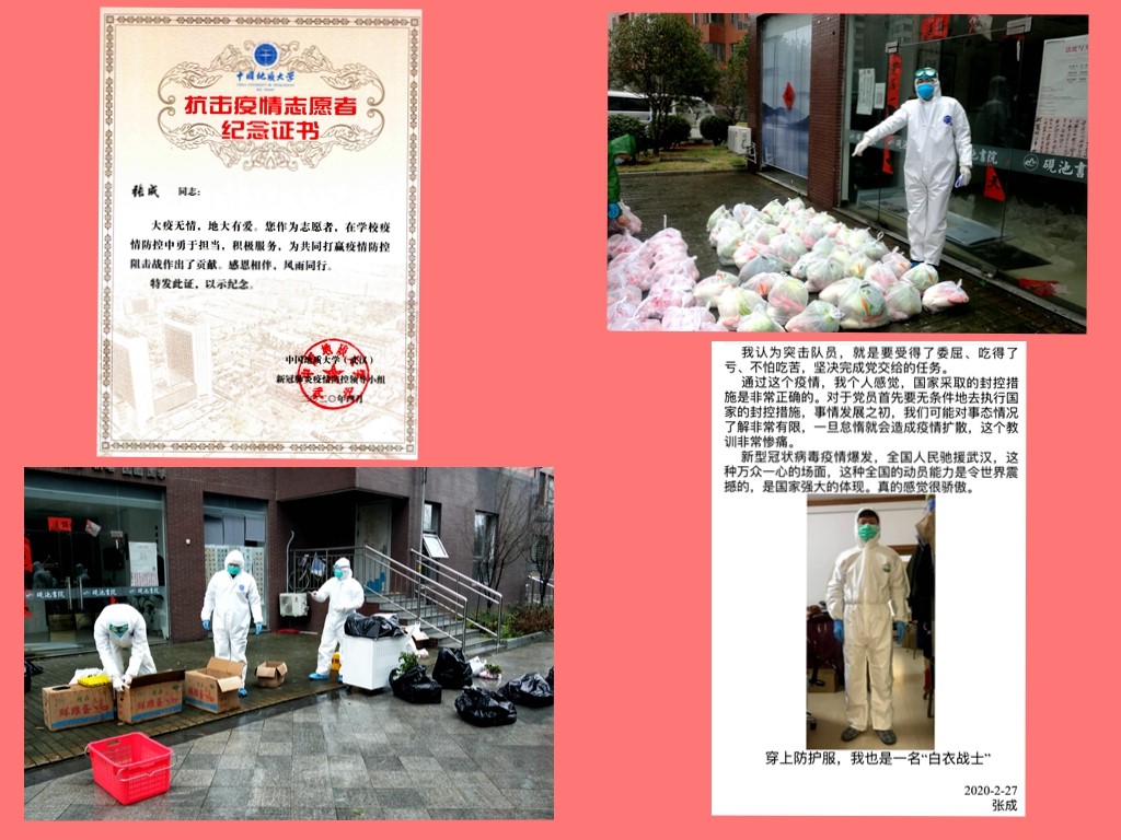 实验中心党支部组织、纪检委员张成同志,在得知糖果派对 疫情防控人员紧张,组建志愿者服务队时,主动请缨报名参加了第一批志愿者突击队,承担起包括南望山庄、喻家山庄、东区家属楼的疫情防控工作。随着疫情的严重,封控的措施也不断地升级。突击队主要工作在疫情最严重的一线,就是重点封控楼栋,主要工作比较琐碎:完成楼栋内药品需求和快递拿取信息统计汇总;把住户购买的生活物资、急需药品和快递按户统一,集中转运到各位老师的家门口;垃圾清运、煤气、水卡等充值配送等;必要的时候还给住户要耐心宣传国家政策,安抚情绪。大疫无情,地大有爱!张成同志在糖果派对 抗疫工作中,冲锋在前、勇于担当,风雨兼程,舍小家为大家,为共同打赢疫情防控阻击战作出了突出贡献!他在2020年2月27日的随笔中写道:穿上防护服,我也是一名白衣战士!