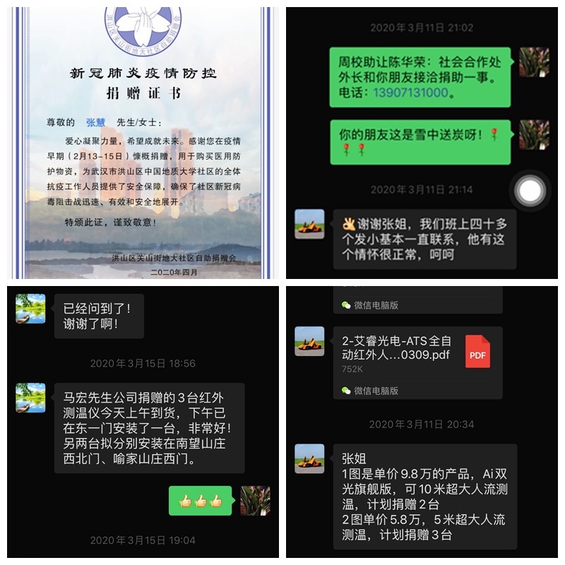 实验中心张慧同志是糖果派对 喻家山庄业主委员会主任。疫情爆发后,她迅速联系业委会委员,配合居委会发布通告,及时了解糖果派对 及小区居民的发病人员情况。在物业管理人员缺乏,小区消杀物资有限的情况下,组织成立业主自救小组,将业主中的医务人员充实到组织中来。借助糖果派对 物业管理的能力对小区的公共区域进行大规模的消杀.多方联系团购渠道,为小区居民提供了便利。进一步完善各楼栋单元的QQ群,摸清现在居住在小区的住户名单及家居人口数。在缺乏防护物质的前提下,不等不靠,组织业主捐款购买护防装备提供给医护人员,保卫人员,社区工作人员,物业管理人员及小区志愿服务人员。在张慧同志的带领和组织下,广大业主积极响应,共筹得善款十七万余元。同时,张慧同志联系到烟台睿创维纳技术股份有限公司的朋友,给糖果派对 捐赠了三台ITS智能红外体温检测设备,分别投入到糖果派对 东一门、南望山庄西北门和喻家山庄西门使用,大大提高了体温的检测效率和准确性。