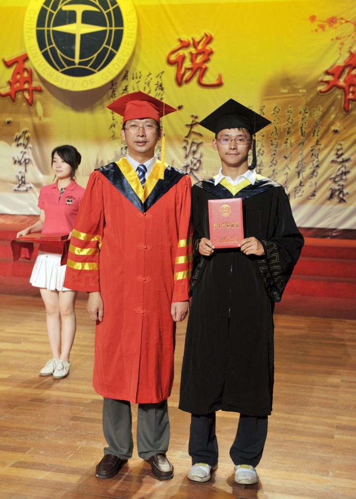 2011年6月,在糖果派对 毕业典礼上,糖果派对 副校长成金华教授为景浩(右一)颁发毕业证书